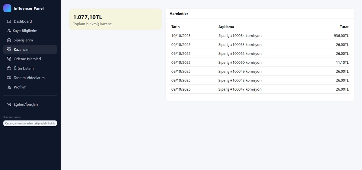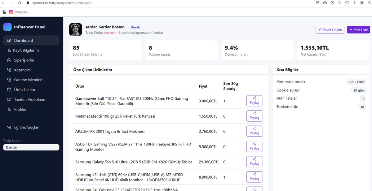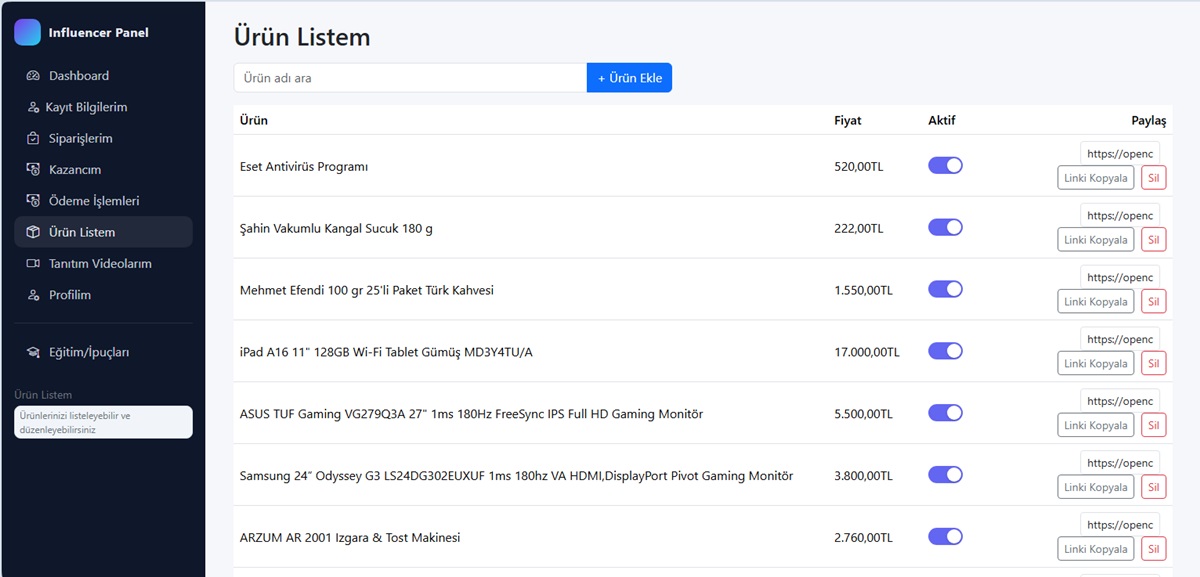 - Ürün linki paylaşabilir , paylaşılan linkten gelen siparişlerden komisyon kazanır infulancer