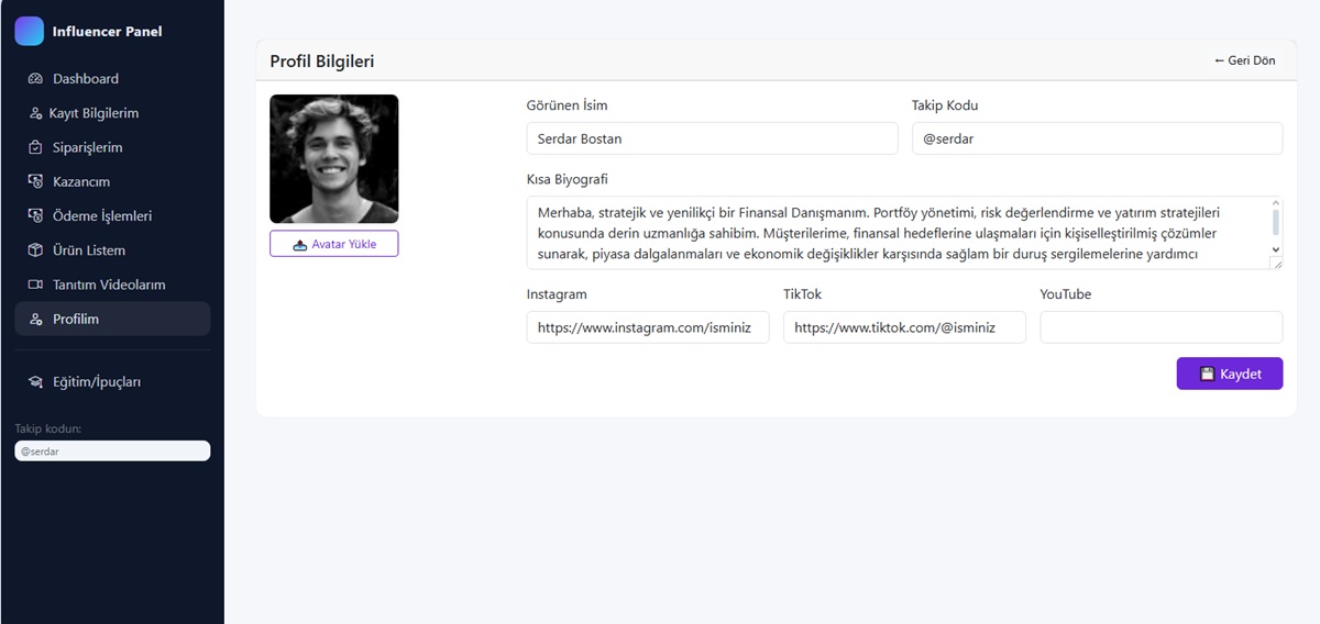 - İnfulancer & satış ortağınız biografisini yazabilir
