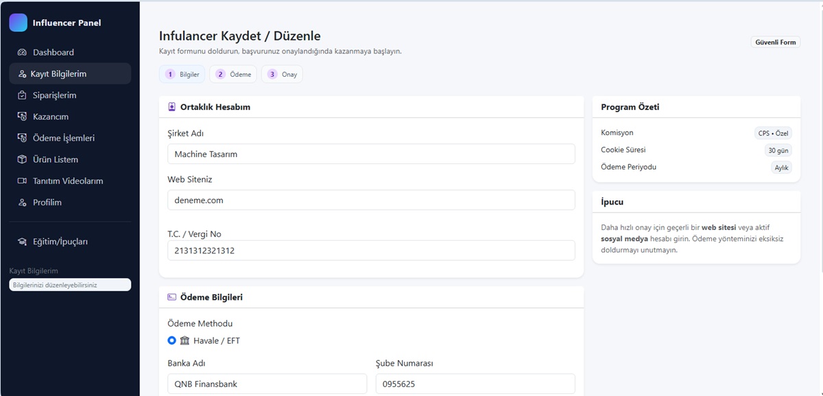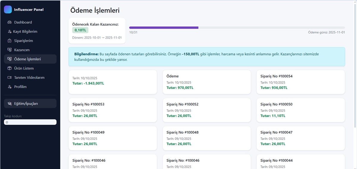 - Gelen siparişleri inflancer & satış ortağınız görebilir takip edebilir
