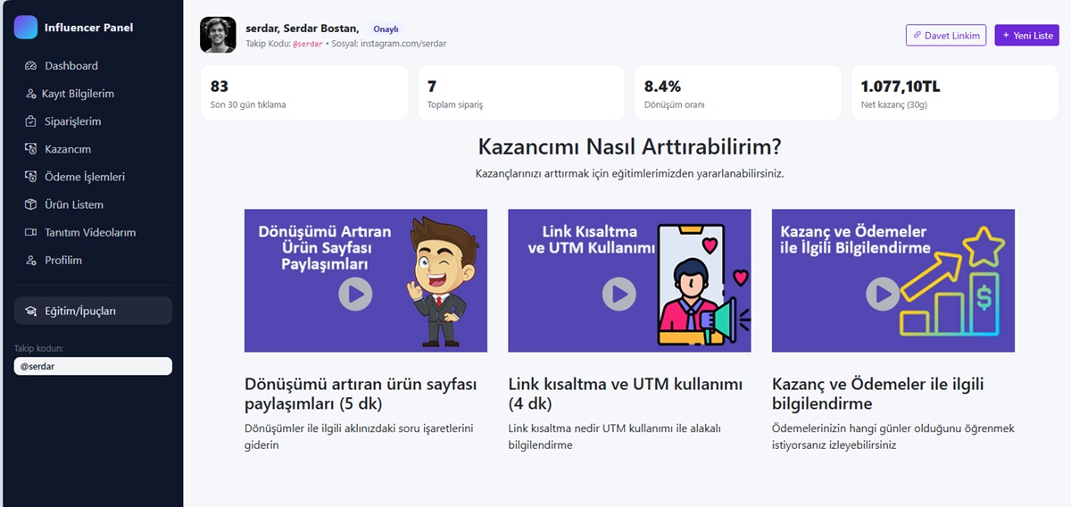 - Ürün linki paylaşabilir , paylaşılan linkten gelen siparişlerden komisyon kazanır infulancer
