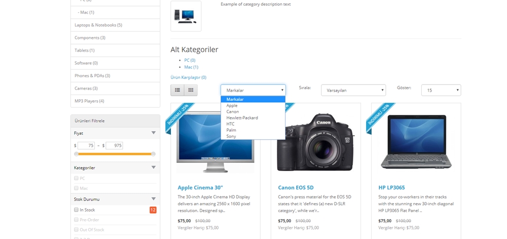 OpenCart Kategoriye ve arama sayfasına göre üreticiye göre filtrele